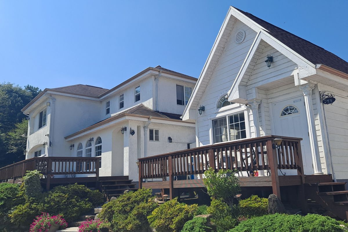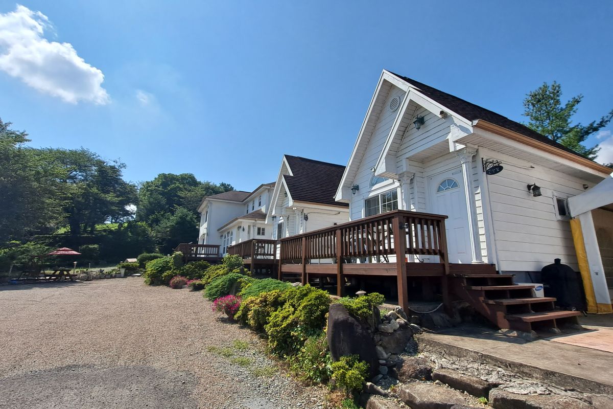 ※그리스풍 목조건물 넓은 테라스 호수 뷰 ※커플및 가족형 ※객실별 따로 바비큐장. ※체육공원( 축구장 /축구장/물놀이장)